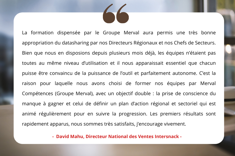 - Le Groupe Merval analyse les données Datasharing et partage un bilan avec la direction des ventes. Si besoin, les tableaux de bord évoluent. Il est fondamental de commencer avec un outil simple, qui s’enrichira au gré de l’utilisation des équipes.
